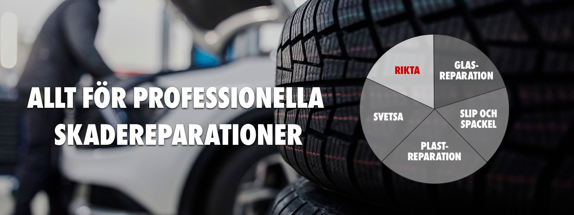 Vi är en helhetsleverantör för dig som jobbar på en skadeverkstad eller med skadereparationer. Hos oss hittar du de förbrukningsmaterial, kemiartiklar, verktyg och maskiner du behöver i din verksamhet.