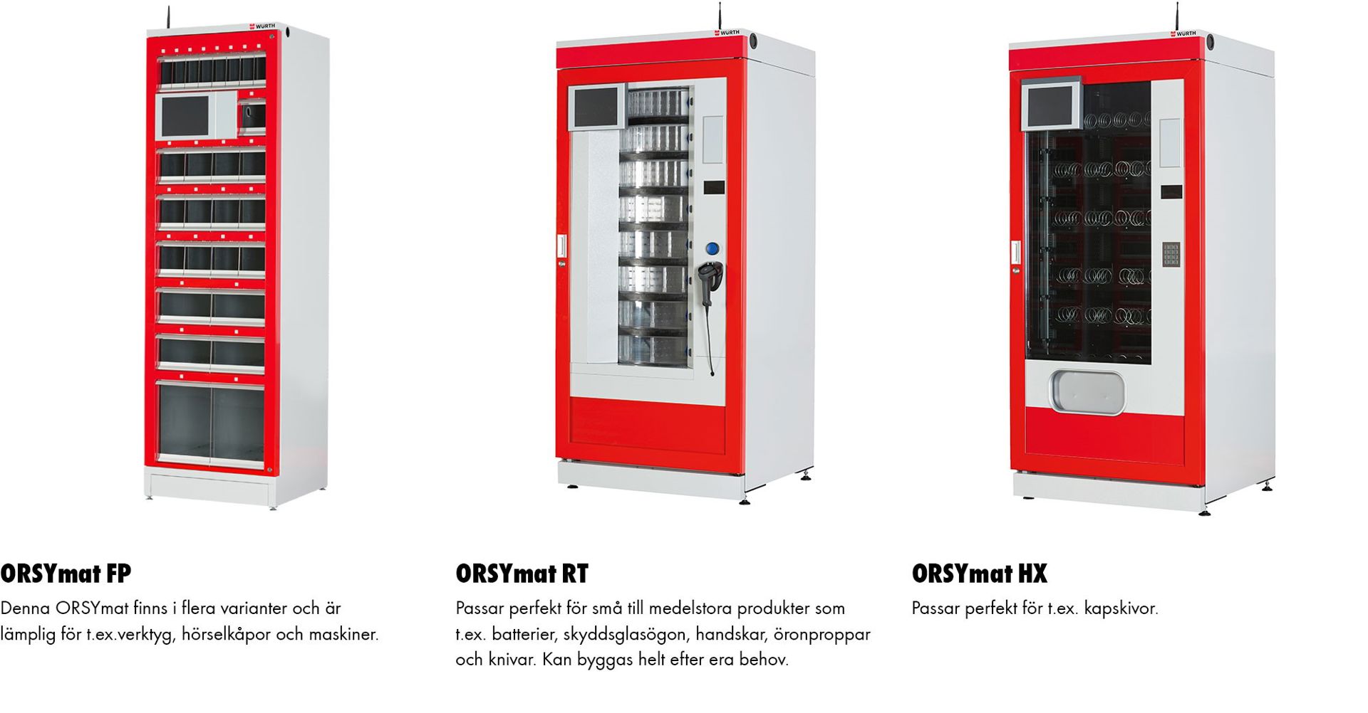 ORSYmat finns i olika modeller och utföranden med helt automatisk materialförsörjning baserad på ert sortiment och förbrukning. ORSYmatens helautomatiska beställningsfunktion gör att ni aldrig behöver vänta på material, vilket är en trygghet för er som kund. De olika modulerna kan kombineras och bilda unika varianter helt anpassade efter er verksamhet och era behov.
